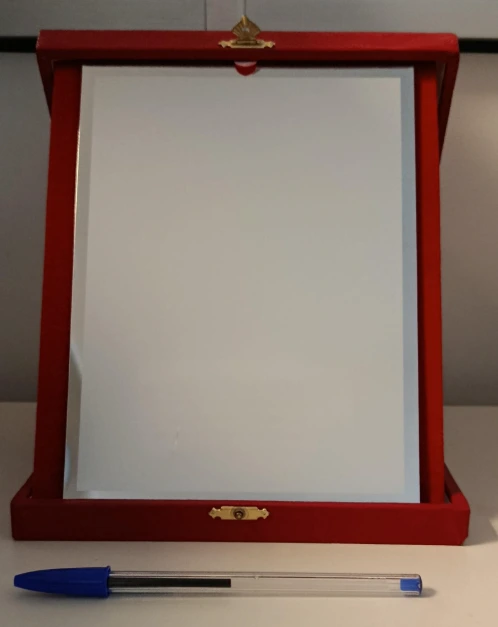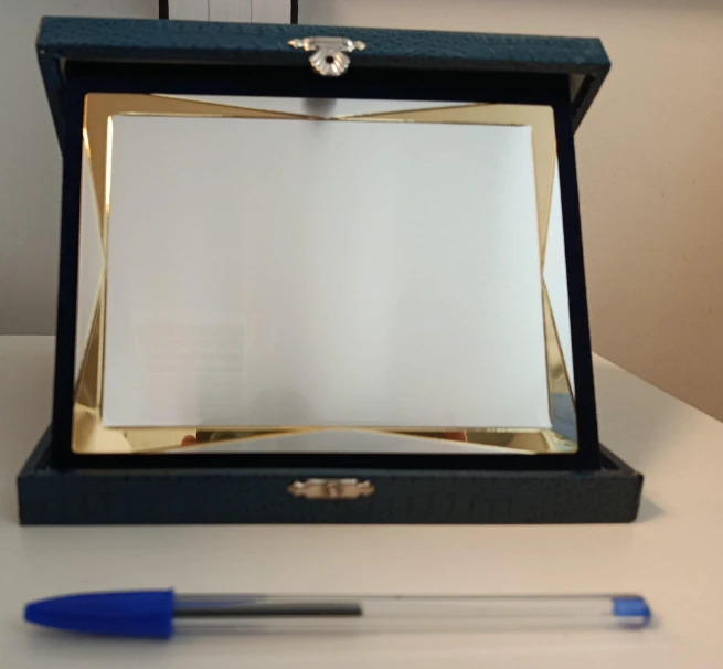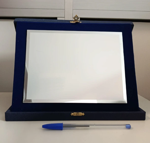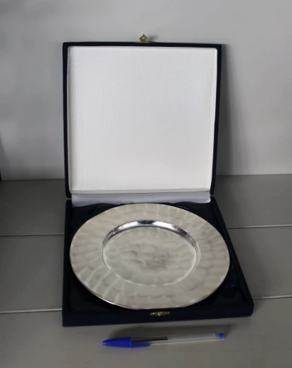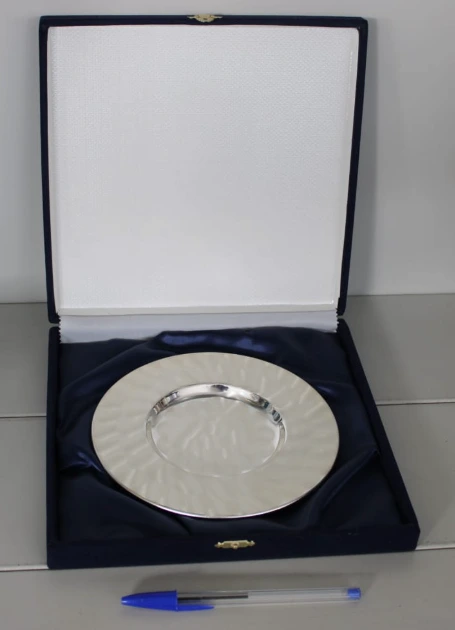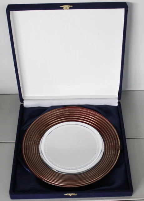 Astuccio con raso blu cm 38×38 con piatto vetro diam. 32 cm e targa tonda centrale