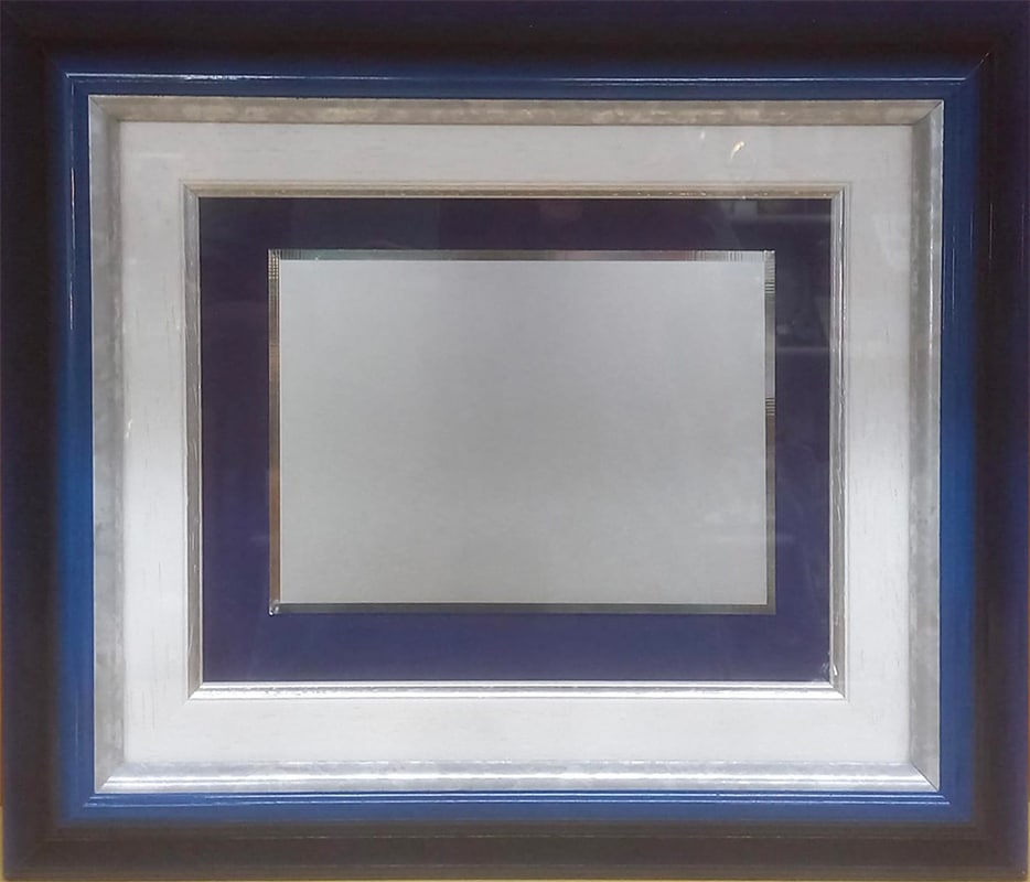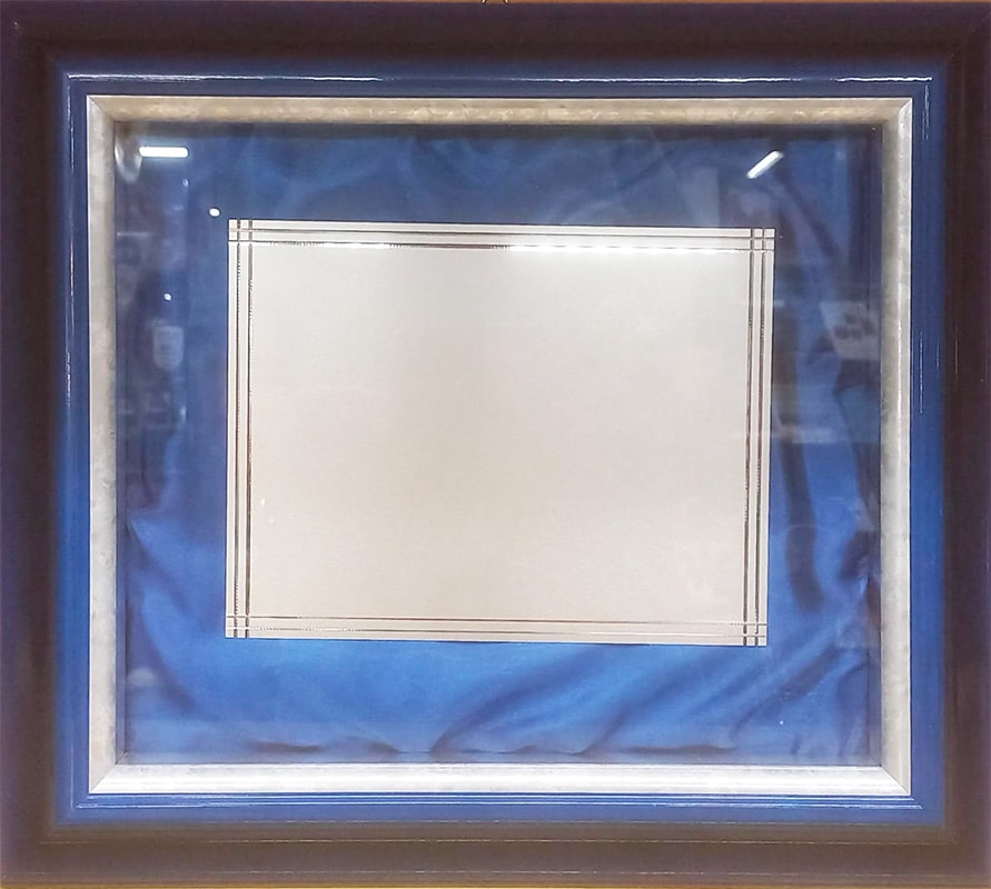 Cornice legno oro-argento cm 26×32 con sfondo velluto blu e targa pergamena silver plated.